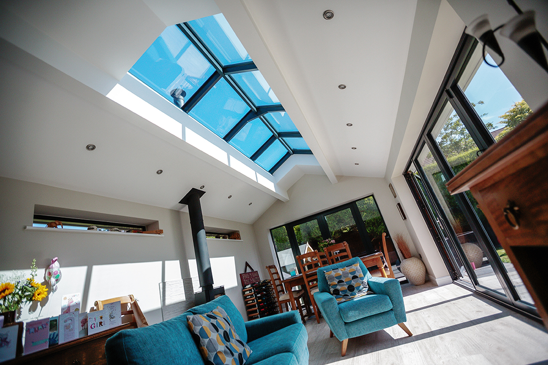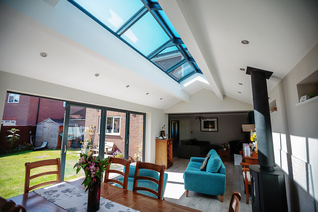 A single storey rear extension featuring bi-fold doors, a log burner and skylights. This extension has transformed the living space in this property. If you would like a similar extension for your property then please get in touch.
